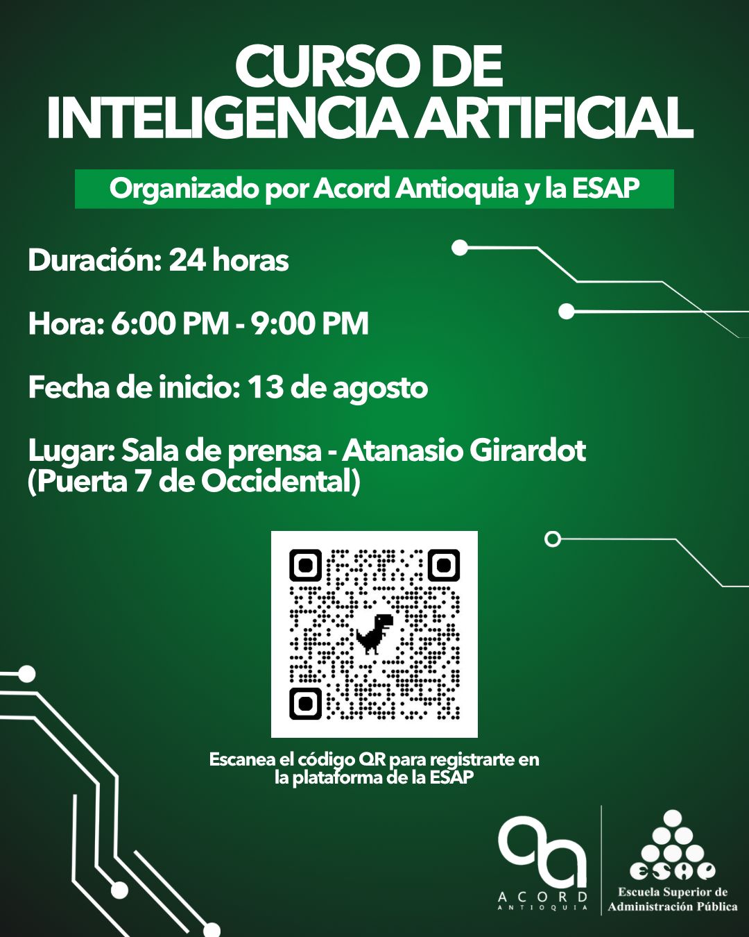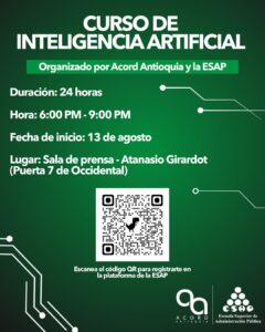 Desde el próximo miércoles 13 de agosto, Acord Antioquia en conjunto con la ESAP realizarán un Curso de Inteligencia Artificial dirigido a todos nuestros socios. El curso tendrá una duración de 24 horas y será todos los miércoles de 6:00 pm a 9:00 pm en la sala de prensa del Atanasio Girardot. La inscripción al curso es completamente gratis y solo tiene 40 cupos disponibles. Los socios que estén interesados en hacer parte de este espacio formativo, nos lo pueden informar a través de nuestros canales de comunicación y allí les daremos todas las instrucciones para que hagan su registro. Aprovechen esta gran oportunidad para seguir sumándole experiencia a su formación académica.