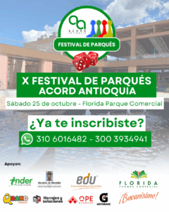 Nuestro gremio se prepara para la décima edición del Festival de Parqués Acord Antioquia que este año se realizará en el Parque Comercial Florida. El próximo sábado 25 de octubre desde las 11:00 de la mañana, niños, jóvenes, adultos y personas de la tercera edad se reunirán en un día lleno de diversión y recreación, donde la bolsa de premios será de 5’000.000 millones de pesos en efectivo y órdenes de compra. La inscripción al evento tiene un costo de 10.000 pesos, con la cual cada participante tiene derecho a disputar mínimo tres partidas. Posteriormente, los jugadores mejor ubicados en la tabla de posiciones clasificarán a las finales que se realizarán el mismo sábado 25 de octubre en horas de la tarde.