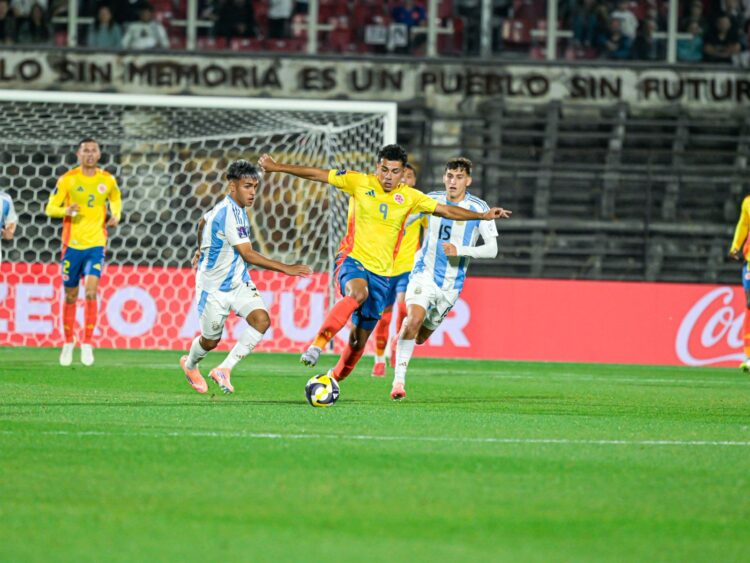 El arranque fue intenso. Colombia se adueñó del balón y se instaló en terreno rival, obligando a Argentina a resistir con orden y apostar por la velocidad en la reacción defensiva. El arquero Santino Barbi volvió a ser determinante: detuvo un cabezazo de Joel Canchimbo y respondió con reflejos ante un disparo de Juan Arizala, uno de los más incisivos del conjunto dirigido por César Torres. Con el paso de los minutos, los dirigidos por Diego Placente se asentaron en el campo: Ian Subiabre, en reemplazo del suspendido Maher Carrizo, probó desde lejos, y Valentino Acuña tuvo una opción clara para el primer gol tras una buena asistencia de Alejo Sarco.