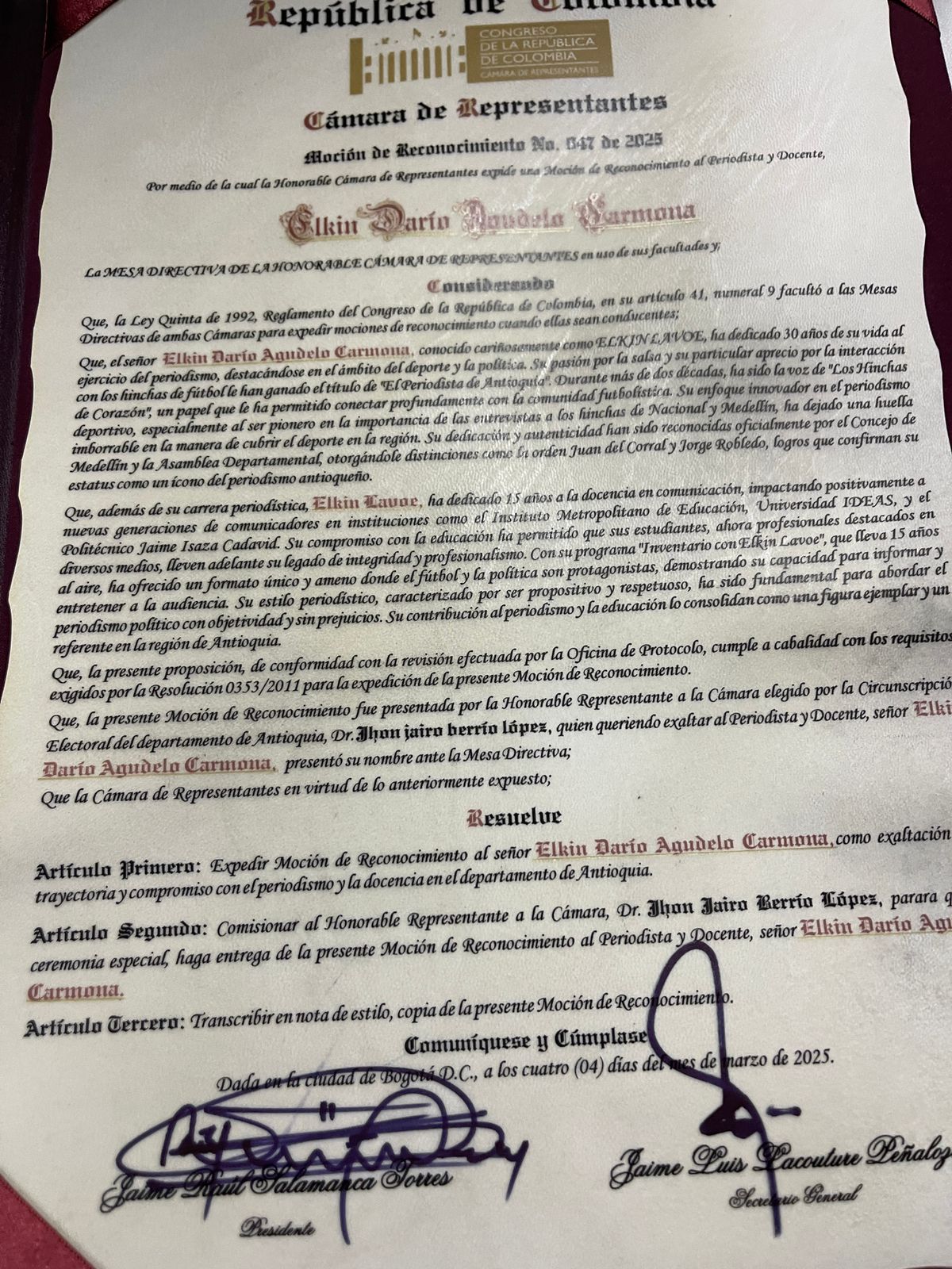 Con este reconocimiento, la Cámara de Representantes celebra «su estilo periodístico, caracterizado por ser propositivo y respetuoso, que ha sido fundamental para abordar el periodismo deportivo y político con objetividad y sin prejuicios». La misma Cámara lo reconoce como una «figura ejemplar y un referente en la región de Antioquia.»