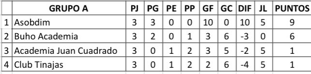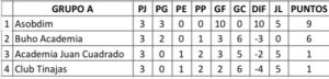 La jornada inició con el encuentro entre Club Tinajas y Academia Juan Cuadrado, partido que finalizó igualado, un resultado que no benefició a ninguno de los dos conjuntos. En el partido por el liderato, Asobdim venció 5 por 0 a Búho Academia y se clasificó primero del grupo A, dejando a los ‘búhos’ como segundos. La Academia Juan Cuadrado aún conserva las esperanzas de clasificar como mejor tercero tras ganarle la posición al Club Tinajas en la diferencia de gol y dejarlo sin chances de pasar a la siguiente ronda.