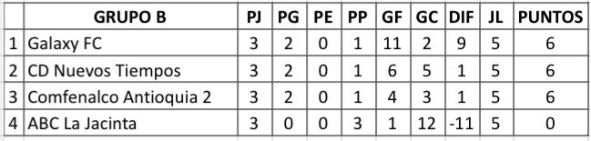 La definición del grupo B inició desde las 2:30 pm con el duelo entre Comfenalco Antioquia 2 y Galaxy FC, encuentro que se llevaron los locales por la mínima diferencia. El segundo partido de este grupo, y el último de la jornada dominical, lo disputaron ABC La Jacinta y CD Nuevos Tiempos, partido que terminó con goleada 3-0 de CD Nuevos Tiempos.